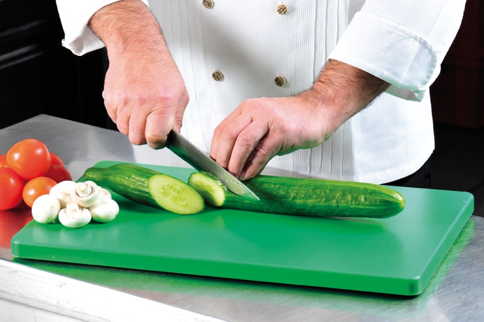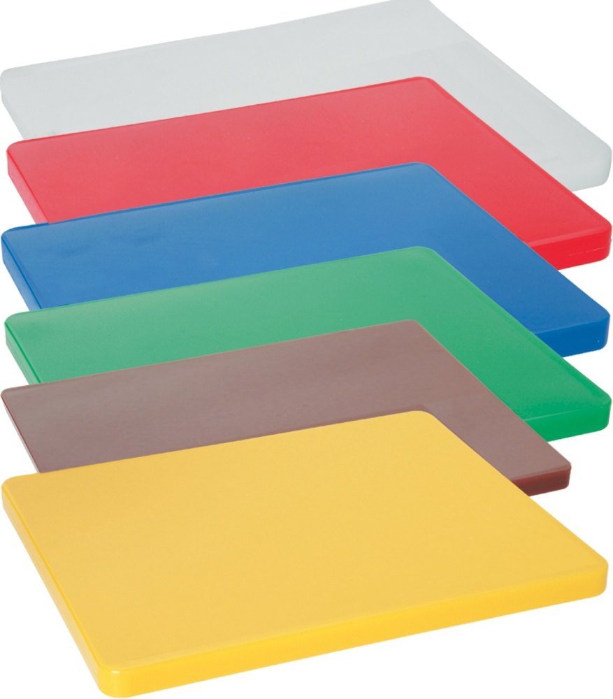Die indirekte Übertragung von pathogenen Mikroorganismen von einem Lebensmittel auf das andere ist nach wie vor ein hohes Risiko. Mit den farbigen Schneidbrettern schaffen Sie Abhilfe, so dass kein Salat auf einem Schneidbrett zubereitet wird, auf dem vorher eine rohe Hühnerbrust lag. Nutzen Sie die verschieden Farben beispielsweise für: rot = rohes Fleisch, blau = roher Fisch, gelb = gekochtes Fleisch, grün = Salat & Obst, braun = Gemüse, weiß = Käse / Brot.