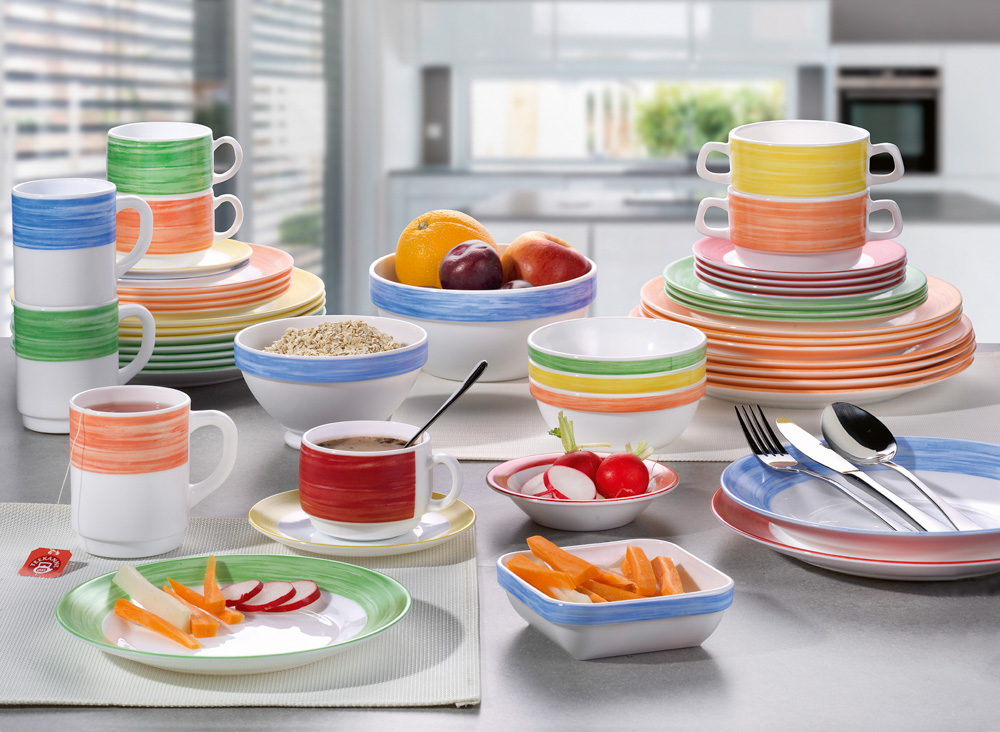 Hartglas-Geschirr gefällt durch die bunte Streifen-Dekoration im