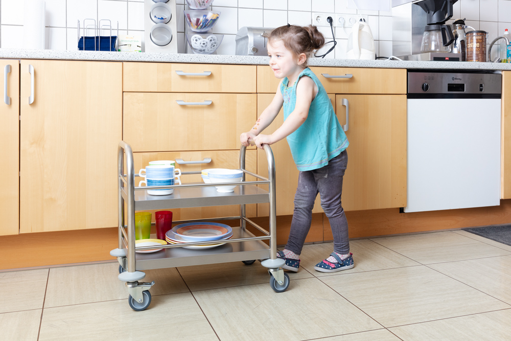 Tiny - Kinder-Servierwagen Der neue Servierwagen für Kinder: Mit 2 Böden und 80 kg Traglast können nun auch die Kleinsten mithelfen. Eigenschaften: Edelstahl 18/0 Klasse C2 Korrosionsbeständig und leicht hygienisch zu reinigen (desinfizierbar). 4 Lenkrollen, 2 davon mit Feststeller Technische Daten: Tragfähigkeit: 80 kg gesamt Abstand zwischen den Böden: 160 mm Rollendurchmesser: 75 mm Gesamtabmessungen (LxBxH): 530 x 375 x 550 mm Gewicht: 6,5 kg